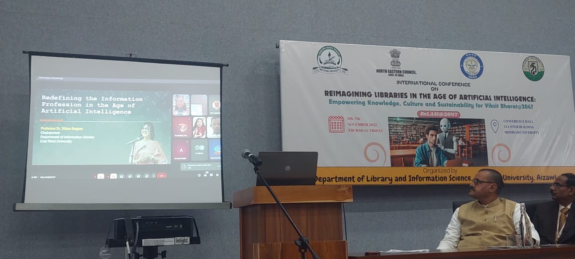 Professor Dr. Dilara Begum, Chairperson, Department of Information Studies, East West University, was invited as a speaker at the “International Conference on Reimagining Libraries in the Age of Artificial Intelligence: Empowering Knowledge, Culture and Sustainability for Viksit Bharat @ 2047 (ReLAAI@2047)”. The conference was organized by the Department of Library and Information Science, Mizoram, India on 6th and 7th November 2025.
