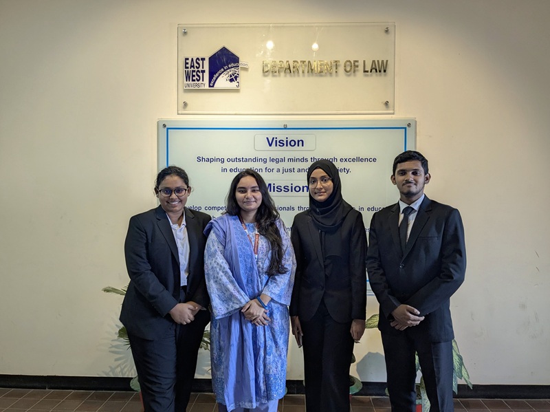 A team from the Department of Law, East West University has achieved a remarkable 2nd Quarter Finalist position and the Best Female Oralist Award at the Asian Law College International Moot Court Competition 2025, held in Noida, India, surpassing 24 international teams. The team, representing Bangladesh as the sole Bangladeshi participant, was selected and funded by the Bangladesh Society of International Law (BSIL).