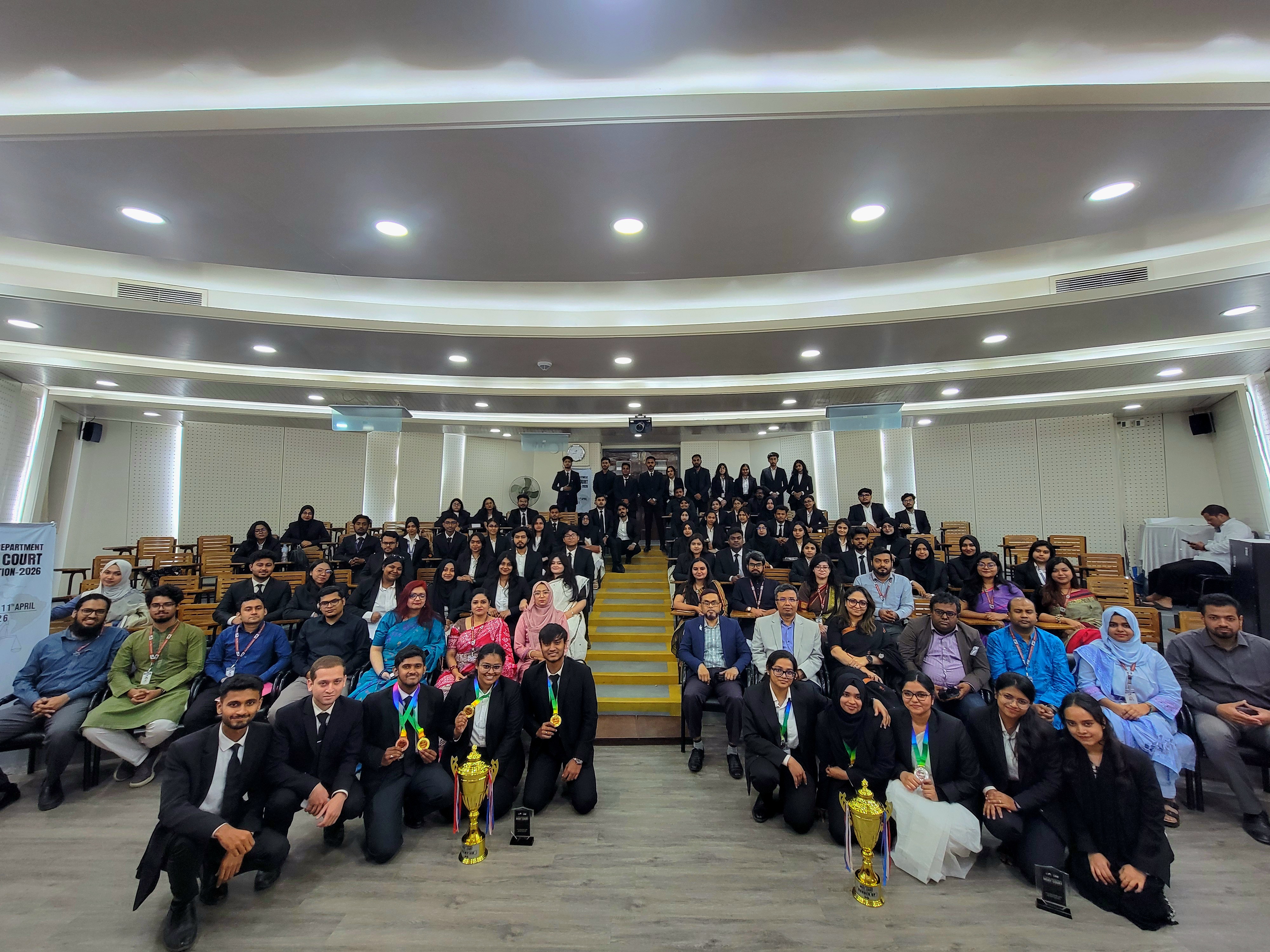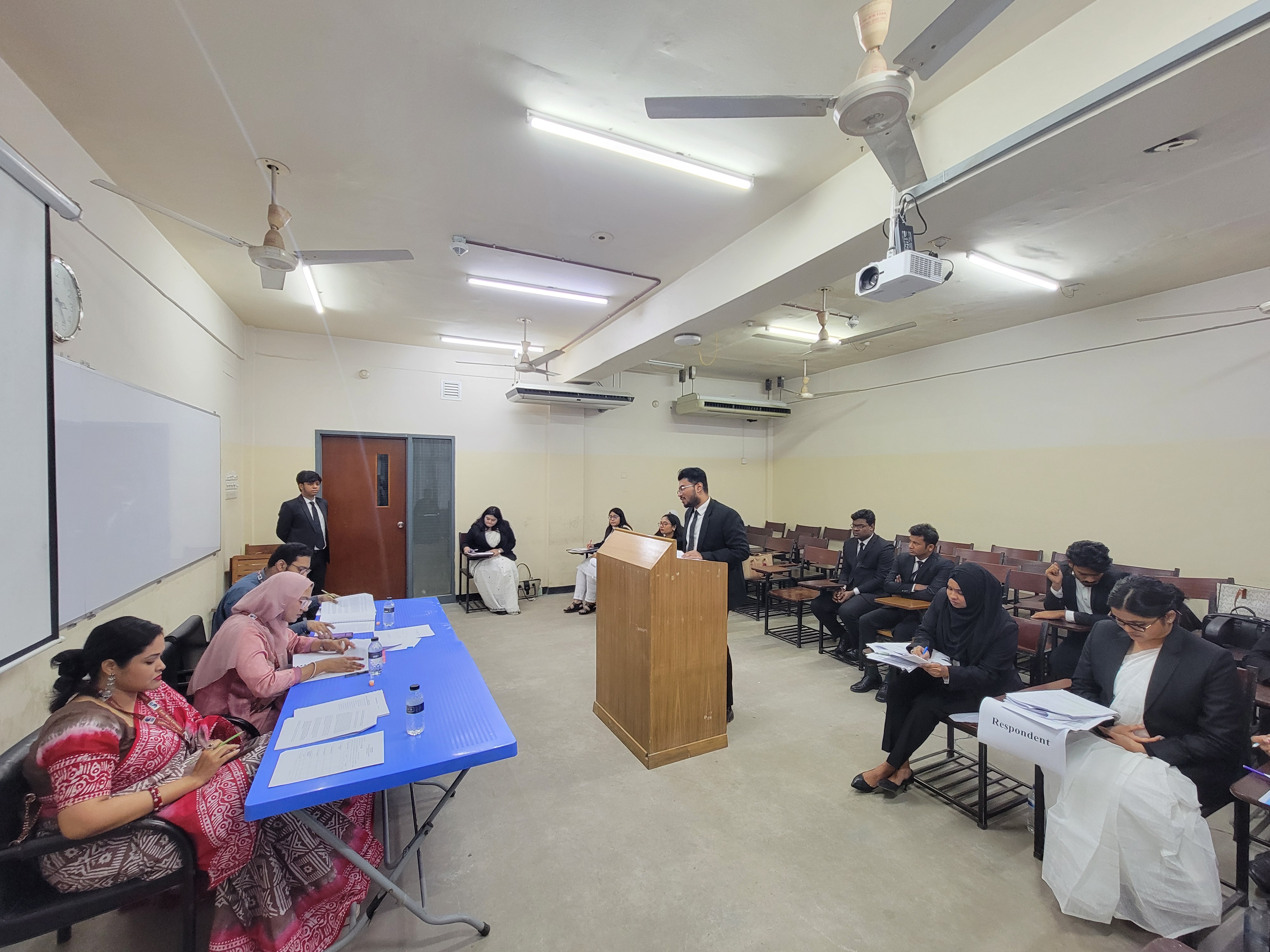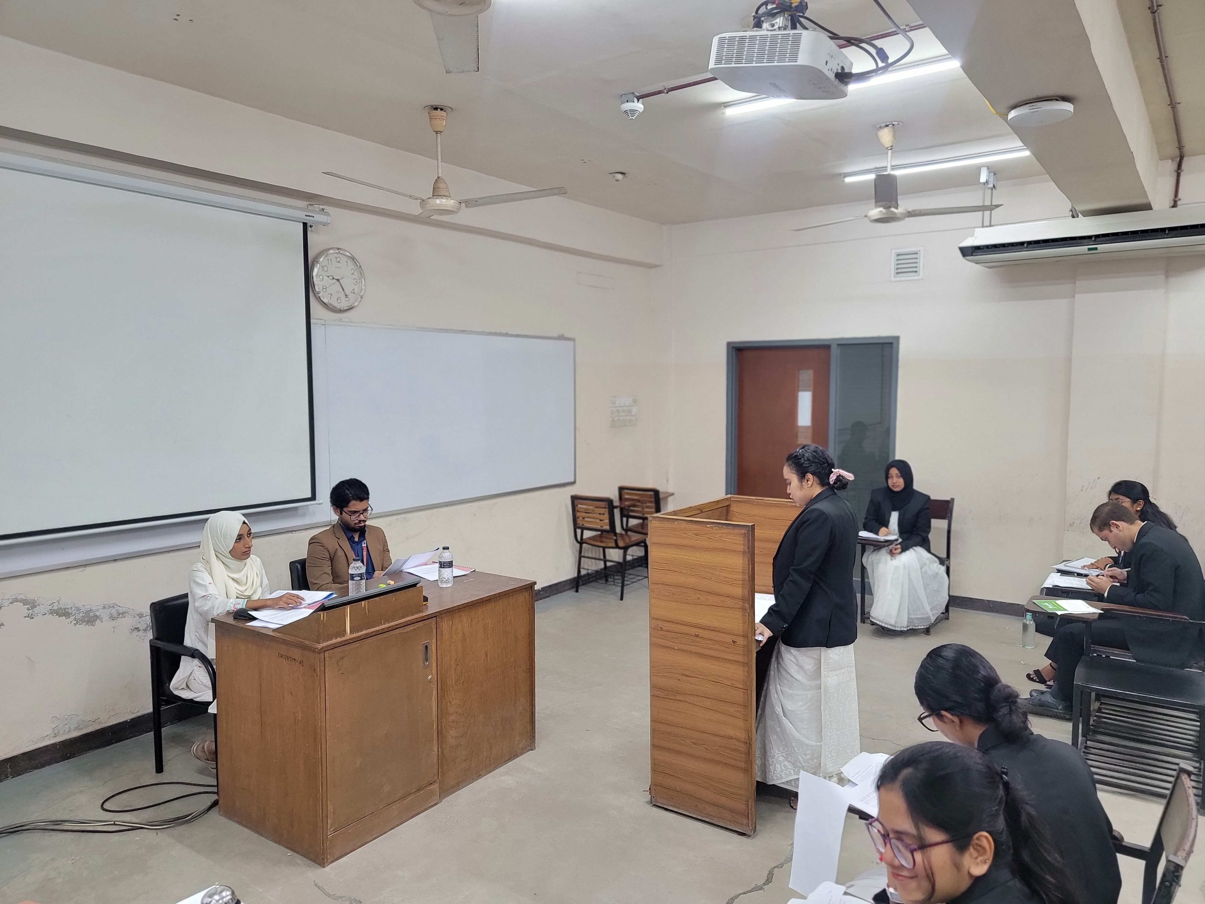 The initial rounds were held on 10 April, and these rounds were adjudicated by seventeen former mooters and early-career legal professionals from reputed institutions. The semi-final and final rounds were held the next day, on 11 April followed by the prize-giving and closing ceremony. After the preliminary rounds, eight teams qualified for the quarter-final stage, from which four teams advanced to the semi-finals. Ultimately, two teams, Team T35 and Team T11 qualified for the final round. The final round of the Intra-Department Moot Court Competition was adjudicated by a distinguished bench comprising Dr. Md. Mahbubur Rahman, Professor, Department of Law, University of Dhaka; Barrister Rashna Imam, Senior Advocate, Supreme Court of Bangladesh; and Md. Monzur Rabbi, Advocate, Supreme Court of Bangladesh.