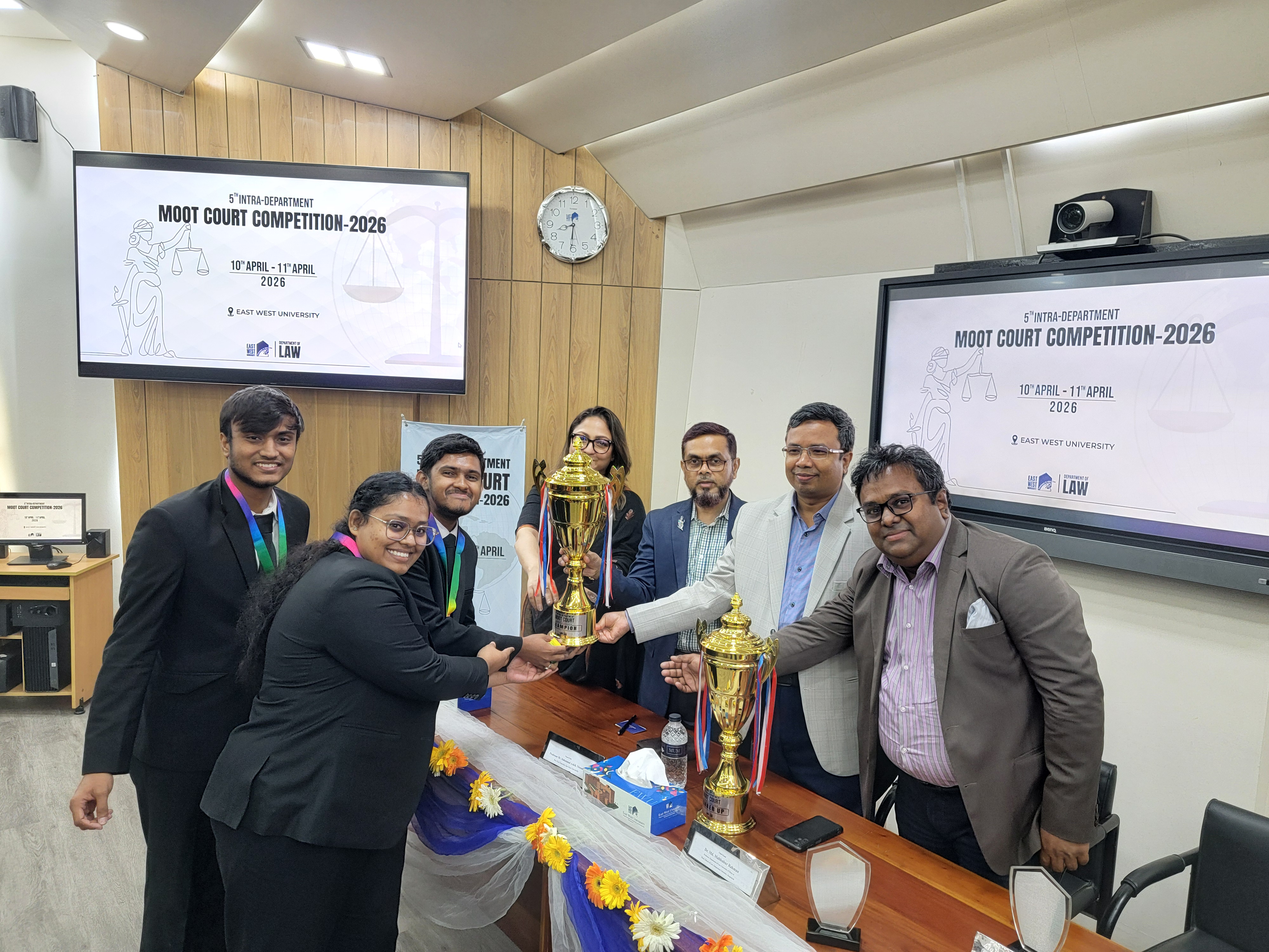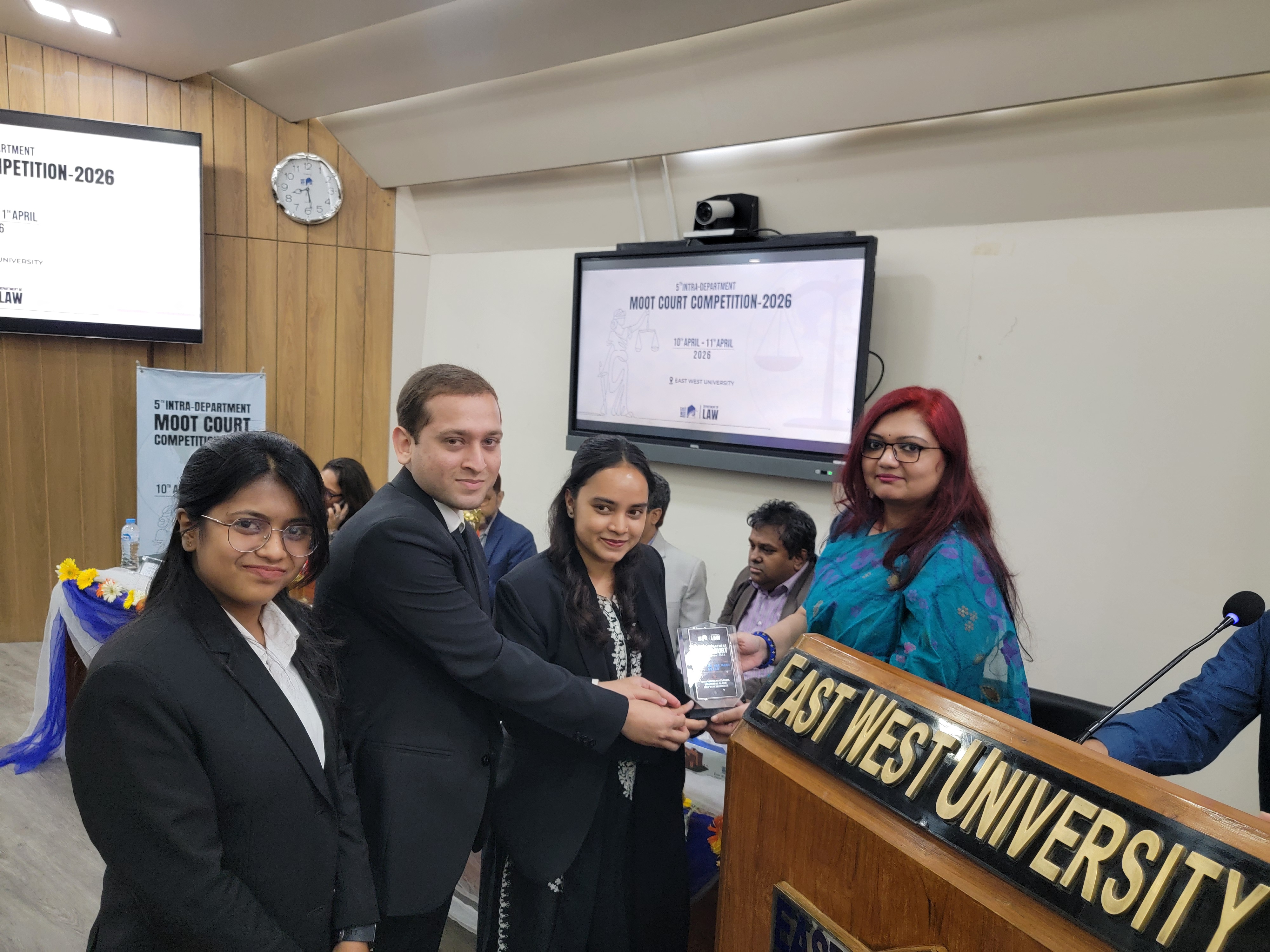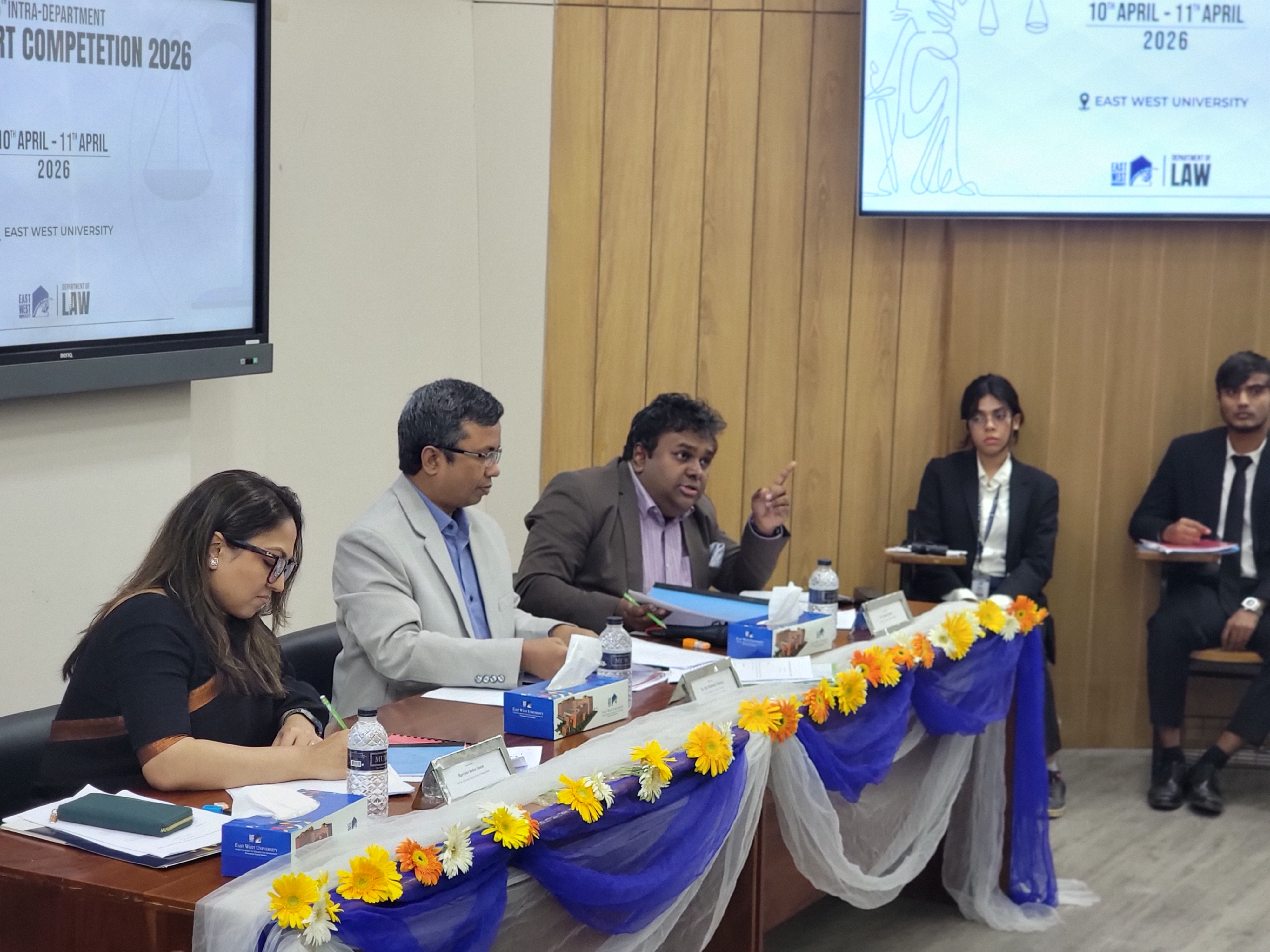 The Department of Law, East West University successfully organized the 5th Intra Dept Moot Court Competition on 10–11 April 2026. A total of thirty-nine teams from the Department of Law registered for the competition, among which twenty-seven teams actively participated in the two-day event. The competition was structured into four competitive rounds: Preliminary, Quarter-Final, Semi-Final, and Final.