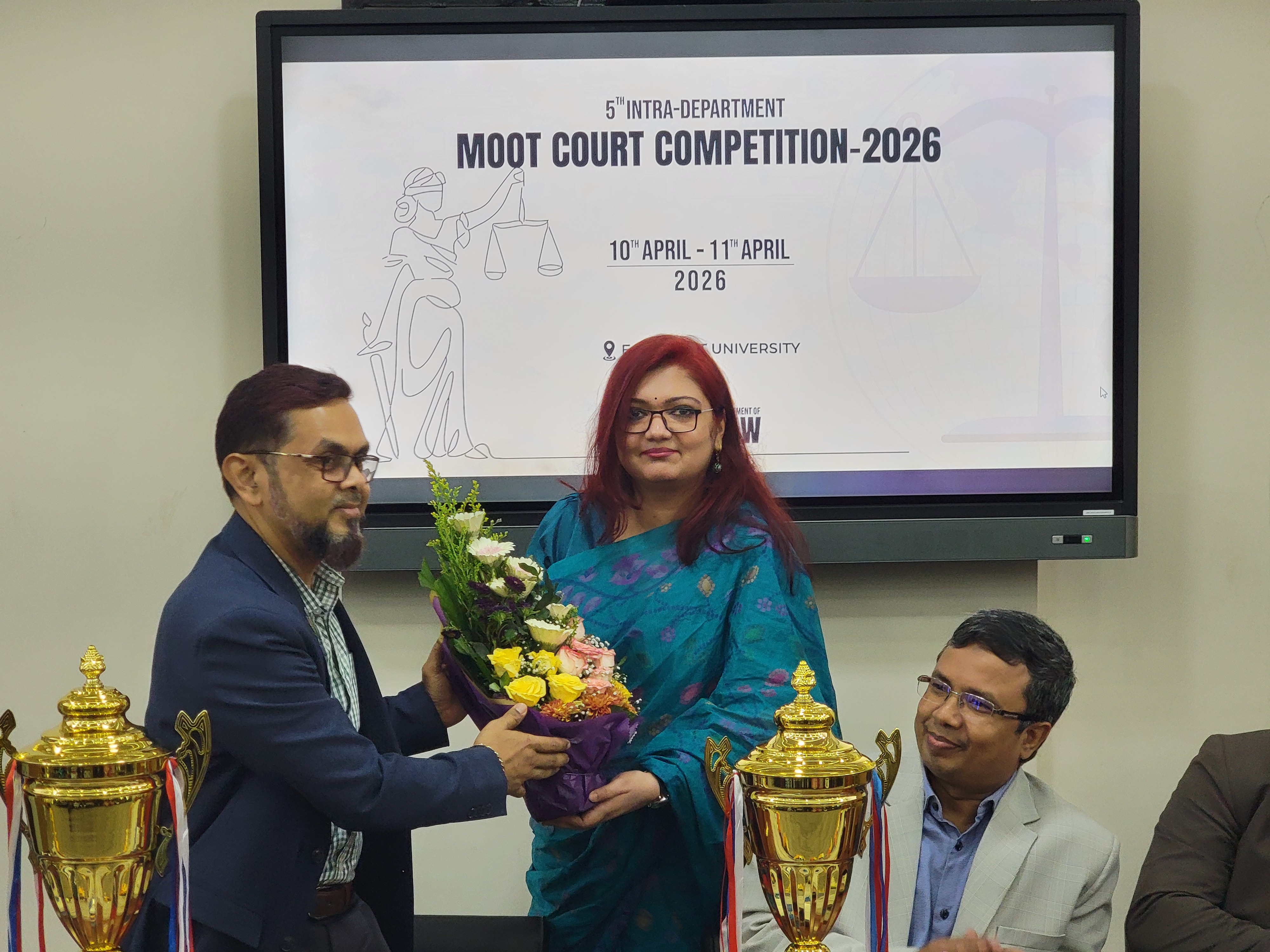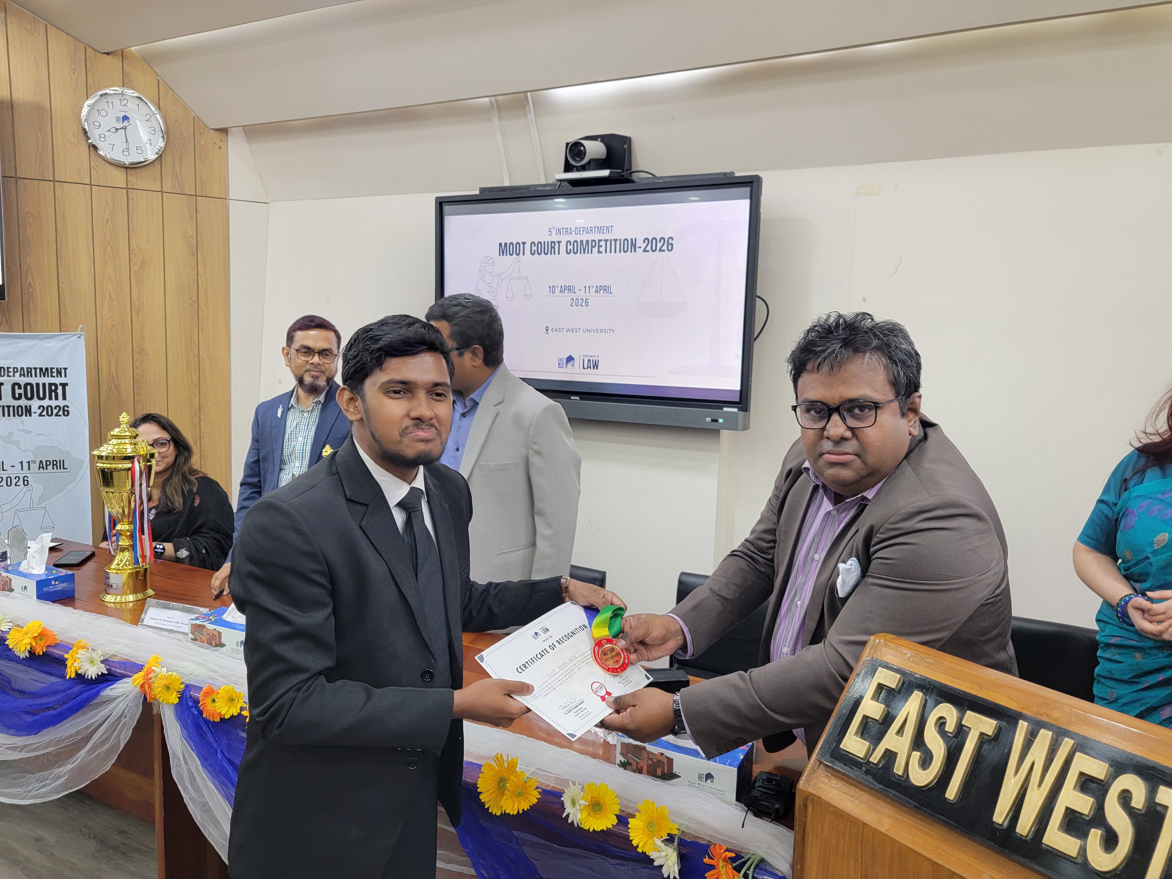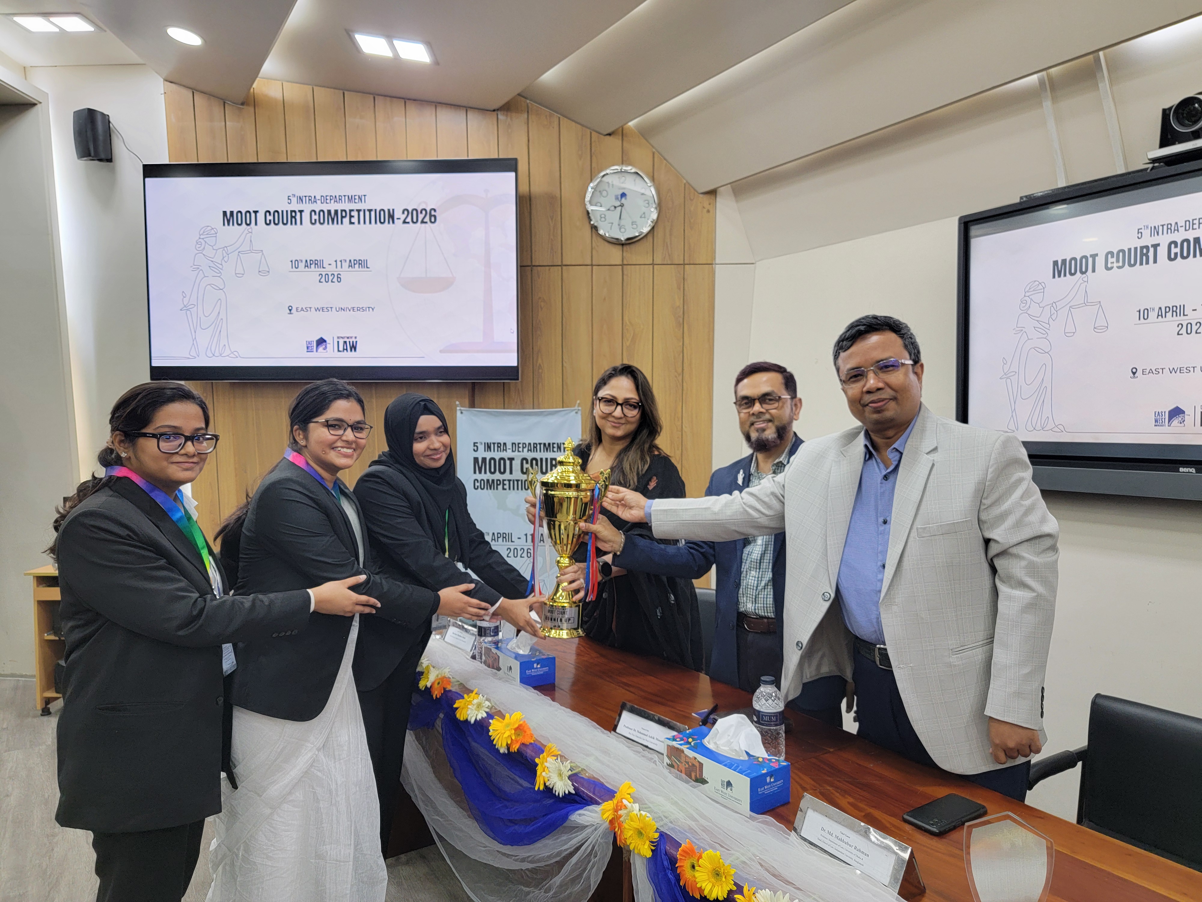 The Department of Law, East West University successfully organized the 5th Intra Dept Moot Court Competition on 10–11 April 2026. A total of thirty-nine teams from the Department of Law registered for the competition, among which twenty-seven teams actively participated in the two-day event. The competition was structured into four competitive rounds: Preliminary, Quarter-Final, Semi-Final, and Final.