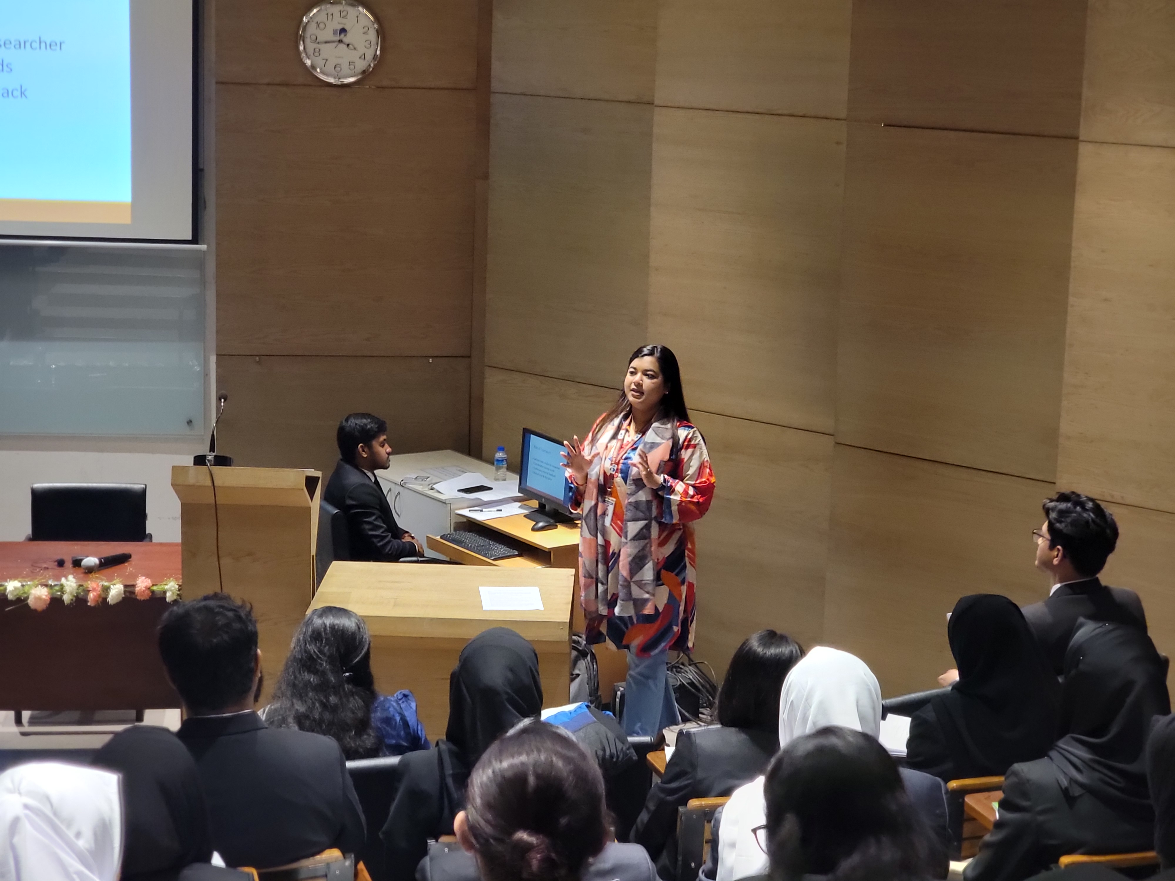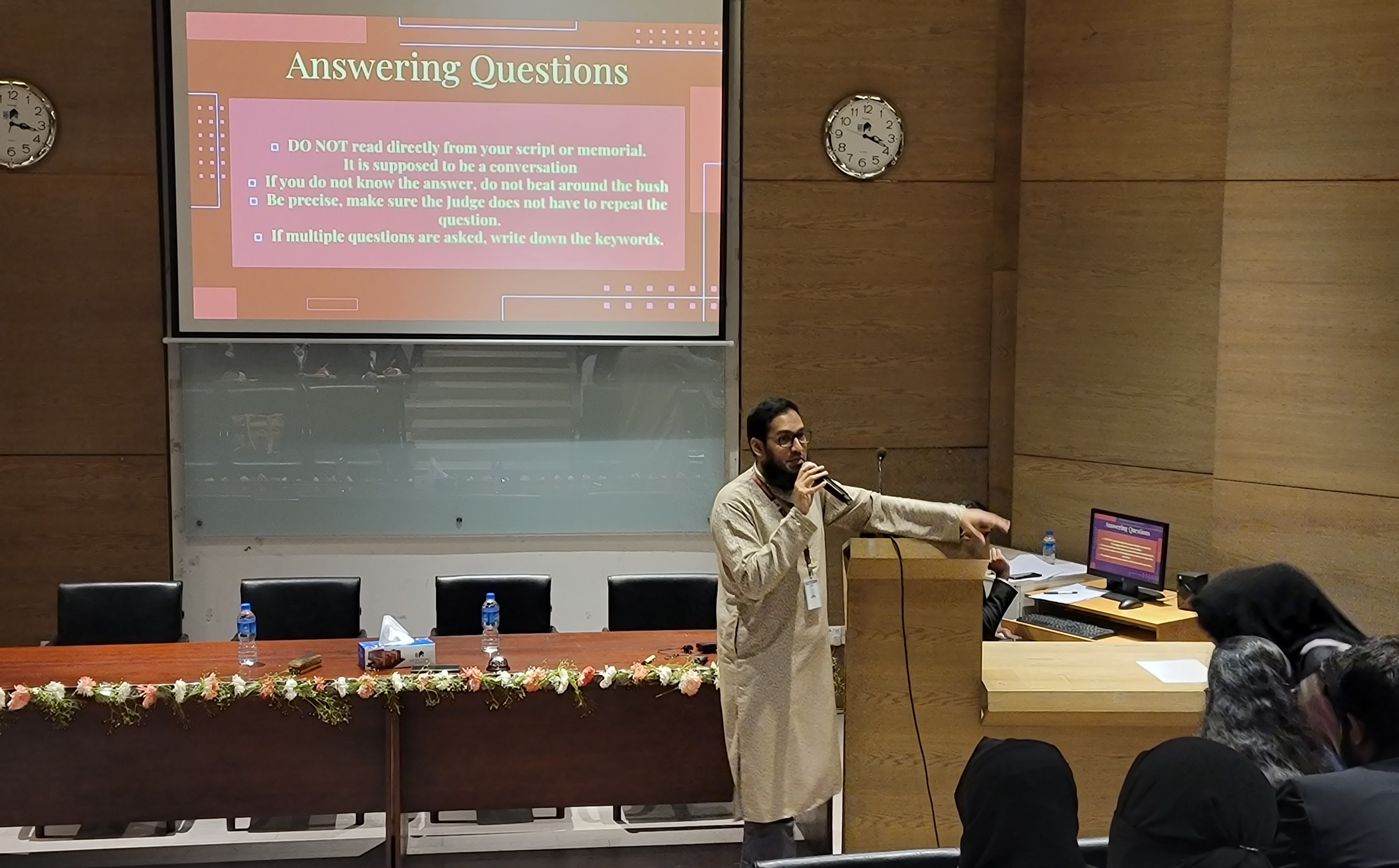 Later in the day, Oishe Rahman, Lecturer, and Ali Mashraf, Senior Lecturer, conducted an engaging session on “Oral Advocacy and the Art of Presentation.” The concluding lecture was delivered by Nur-A Ariya Alam, Lecturer in Law, who shared effective strategies for becoming a successful moot champion and Md. Salmun Alam, a Final Year LL.B. student showcased his recent achievement of Championship in a national Moot Court Competition which further enhanced participants inspiration for mooting.