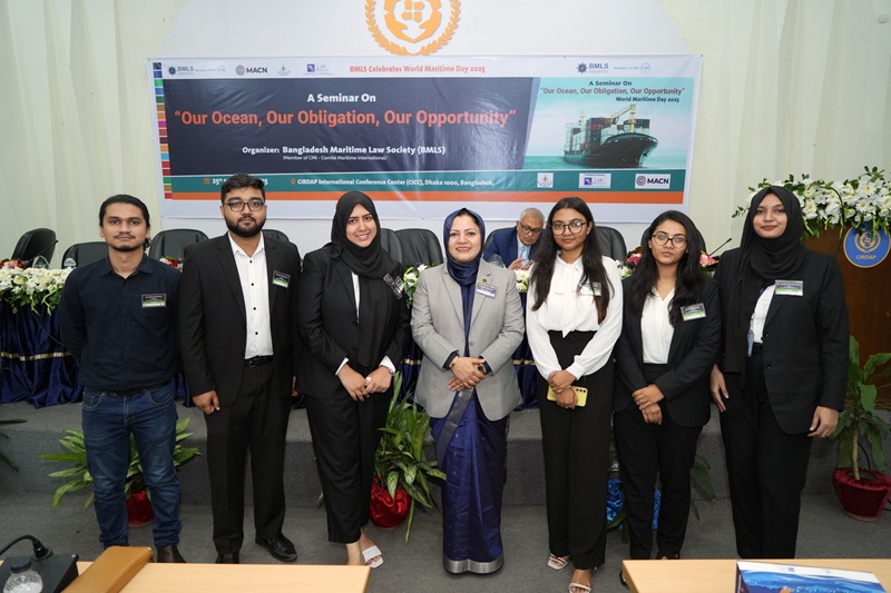 Students from the Department of Law, East West University, proudly participated in the “World Maritime Day 2025 Seminar” held on 25 September 2025 at the CIRDAP International Conference Centre, Dhaka. Organized by the Bangladesh Maritime Law Society (BMLS), the seminar was themed “Our Ocean, Our Obligation, Our Opportunity” and aimed to promote dialogue on the significance of maritime law, ocean governance, sustainability, and international cooperation.