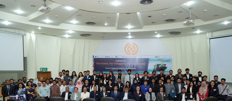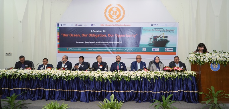 The seminar was chaired by Justice AFM Abdur Rahman (Retd.), Supreme Court of Bangladesh. He emphasized on the strategic importance of Bangladesh’s blue economy. Rear Admiral Dr. Khandakar Akhter Hossain, Vice-Chancellor of Bangladesh Maritime University, delivered an address as the Chief Guest on the intersection of artificial intelligence and ocean conservation. The event brought together policymakers, government officials, legal scholars, and maritime professionals to discuss key issues such as maritime security, environmental protection, sustainable use of marine resources, and the evolving challenges within the international maritime legal framework.