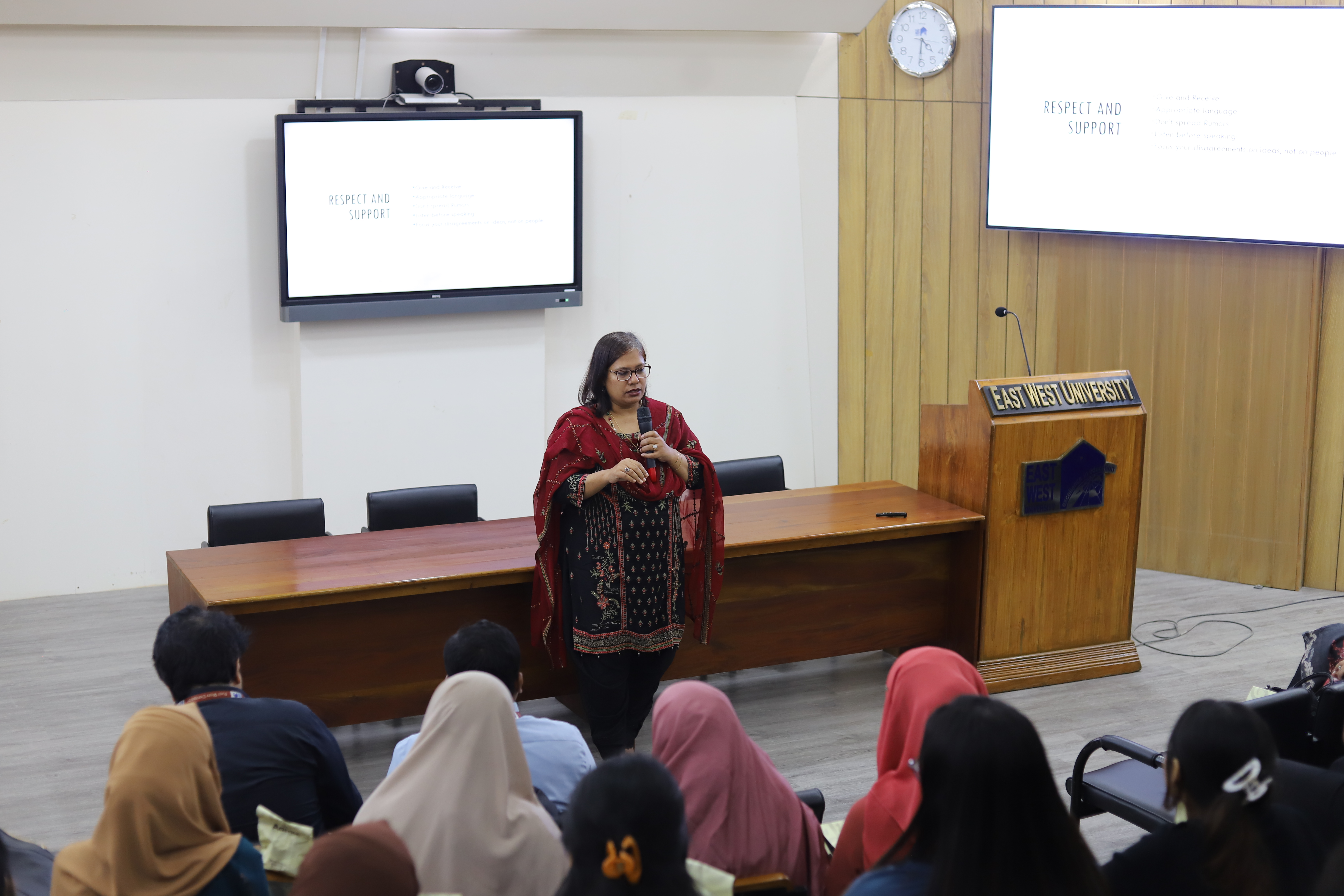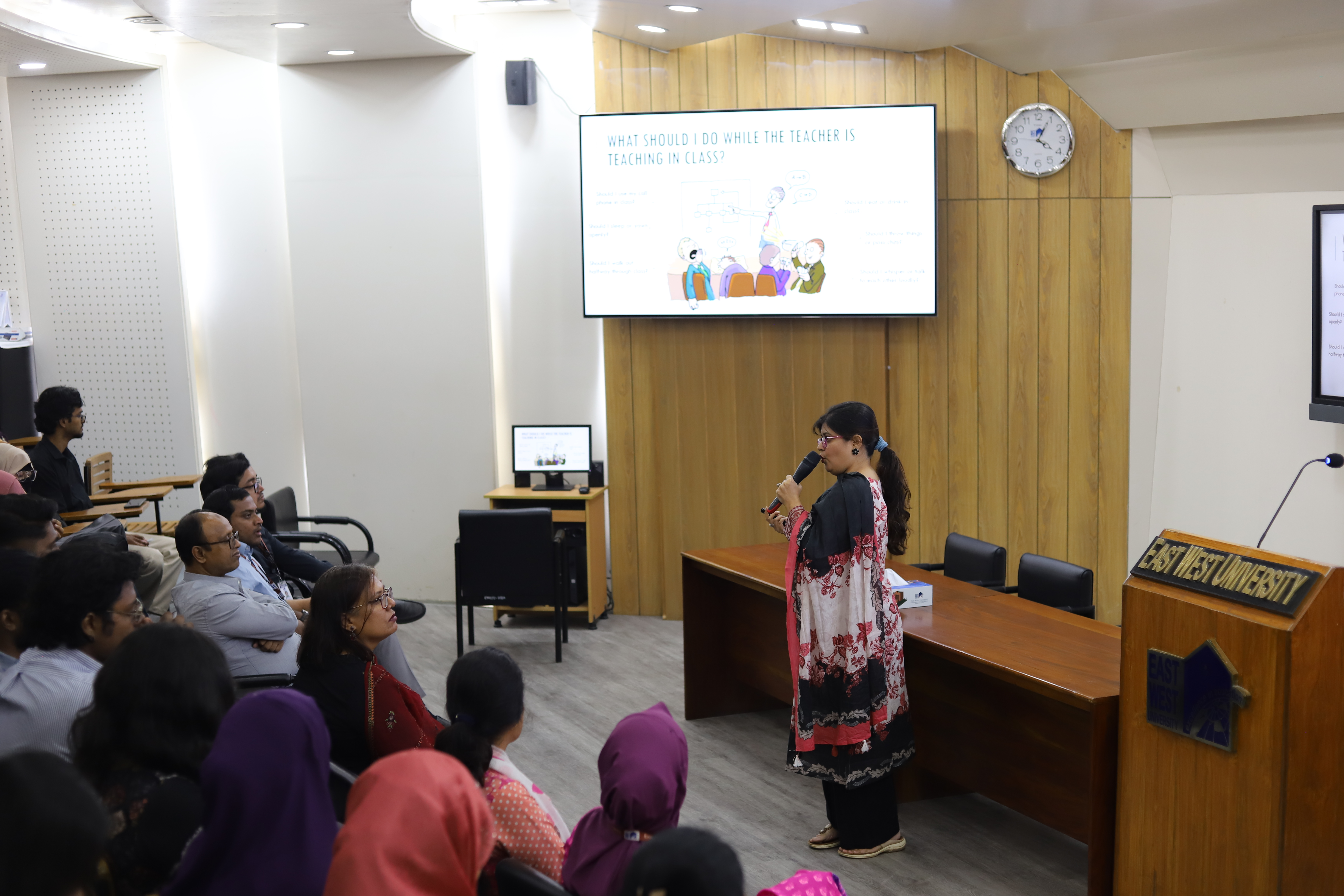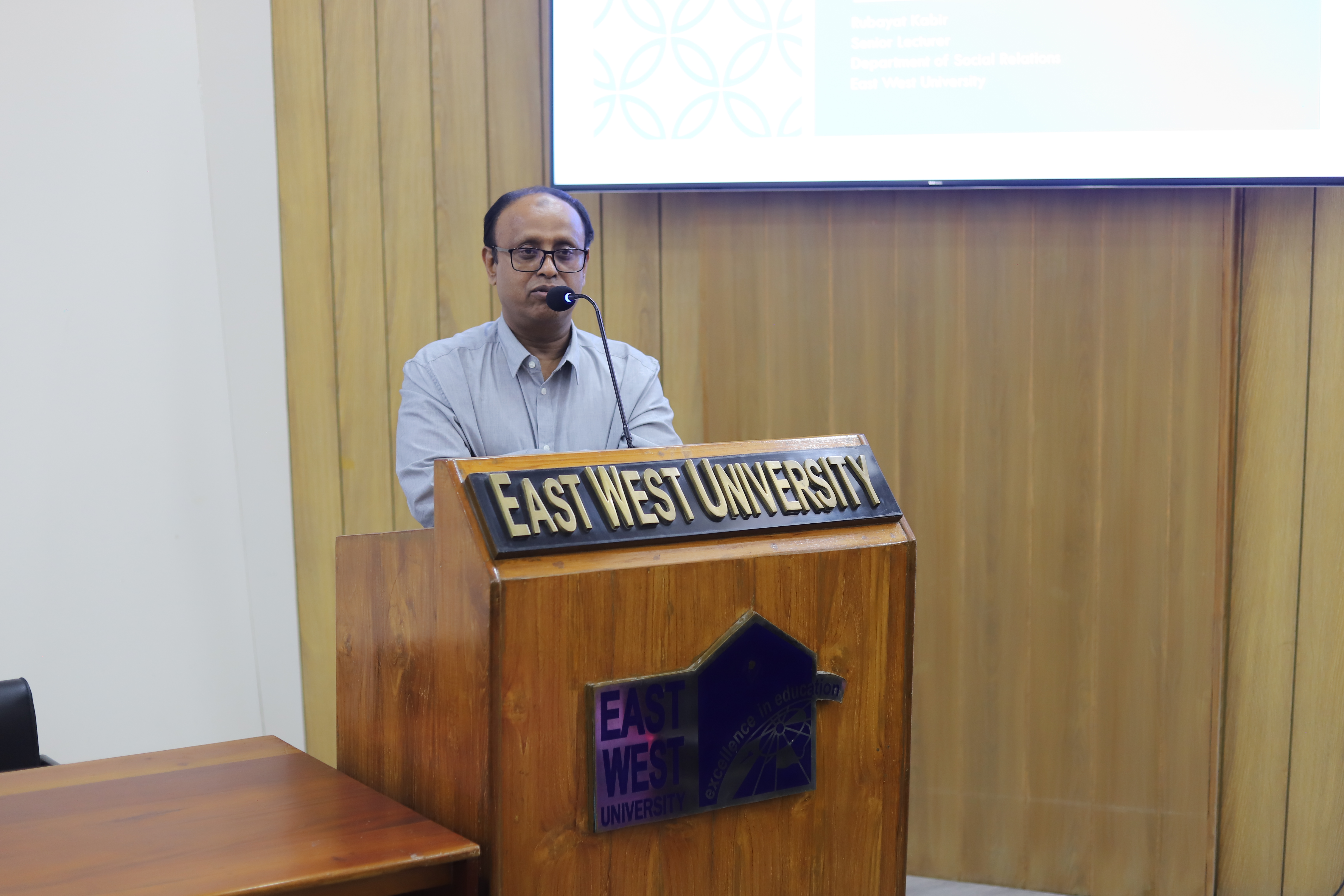 The Department of Social Relations (DSR) at East West University organized a seminar on Social Etiquette on November 6, 2025, at the Nousher Ali Lecture Gallery (Room 126) on campus. The session was designed for first-semester students enrolled in the Population and Public Health Sciences (PPHS) program and aimed to familiarize them with the standards of behavior expected at the university level.