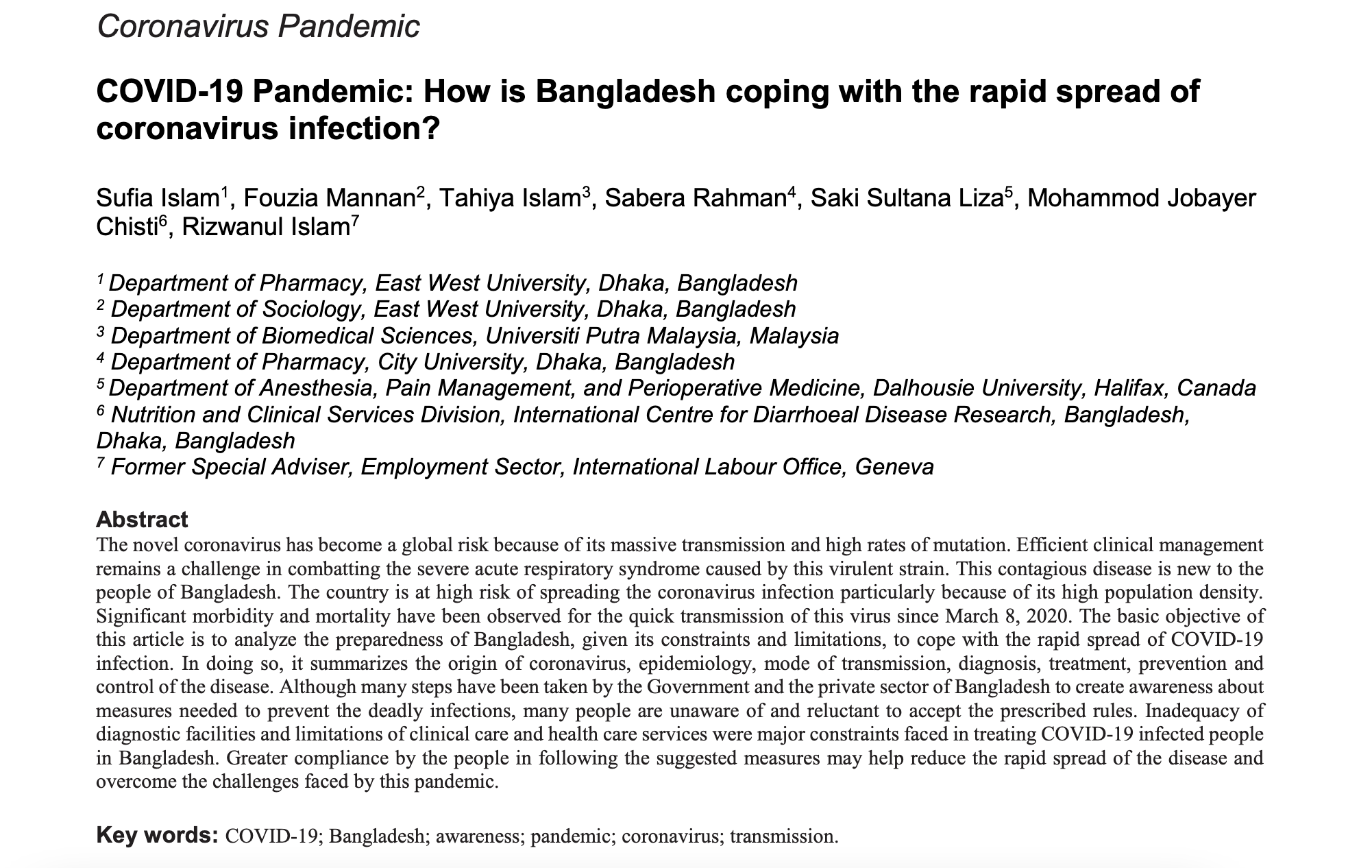 COVID-19 Pandemic: How is Bangladesh coping with the rapid spread of coronavirus infection?| NEW JOURNAL ARTICLE PUBLISHED BY DR. FOUZIA MANNAN